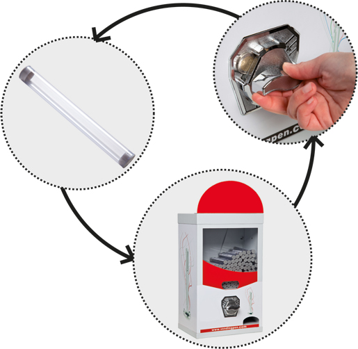 Vendingpen machines provide visibility to the brand and offer endless possibilities for customization, machines, tubes and the products inside. Its operation consists of a patented mechanical system allows the user to enter the price indicated and the machine deliver's one of the tubes.